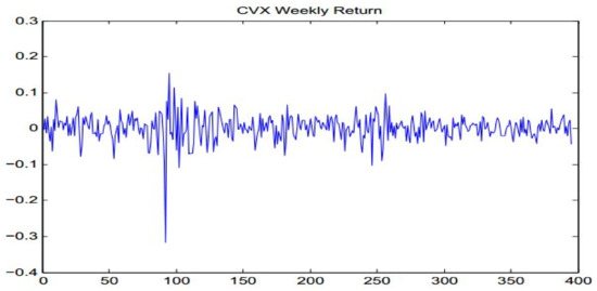 We conduct an empirical example of financial data based on our results presented in Section 2 and Section 3. We choose Chevron shares (hereinafter referred to as CVX weekly financial return data), which were collected from 12 January 2007 to 1 August 2014 to construct the AR models. Figure 3 shows the log transformation of this data set (a total of 395 observations).