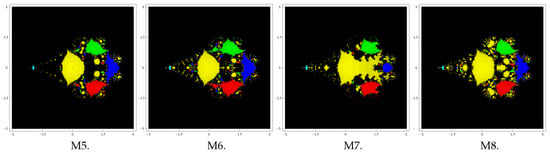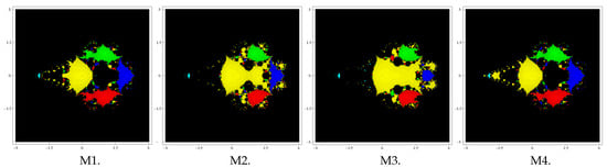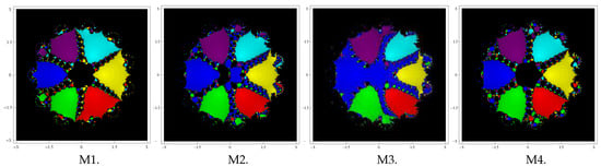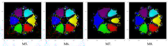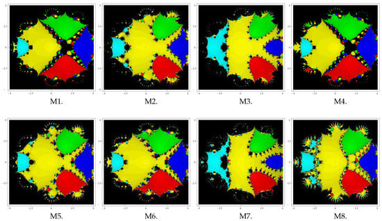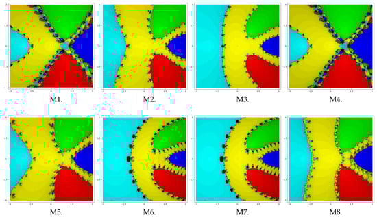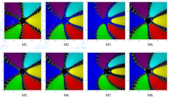 Let us take the polynomial having zeros with multiplicity 3. To see the dynamical view, we consider a rectangle with grid points and allocate the colours colour cyan, green, yellow, red, purple and blue to each initial point in the basins of attraction of zero "," "," "1," "," "" and "." Basins for this problem are shown in Figure 4, Figure 5 and Figure 6 corresponding to parameter choices in the proposed methods. Basins obtained for the methods M1–M8 are shown in Figure 4, Figure 5 and Figure 6 corresponding to . When observing the behaviour of the methods, we see that the methods M3 and M6 possess lesser numbers of divergent points, followed by M1, M4, M8, M2, M3 and M7.
