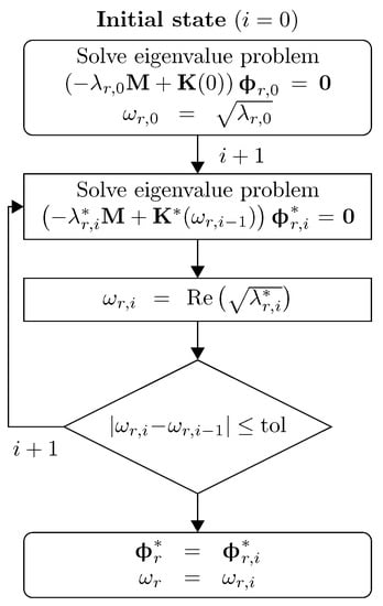 where is the mass matrix, is the natural frequency for mode rth and and are the corresponding eigenvalue and eigenvector (see a book dealing with finite element formulation for the details, for example, [29]). As the stiffness matrix is frequency dependent, an iterative method is needed to compute the eigenpairs of the system. For each mode, the computation starts considering the static stiffness matrix and computing the associated natural frequency. Then, the algorithm shown in Figure 2 is followed, obtaining the natural frequency from the updated stiffness matrix and comparing it to the one computed in the previous iteration. When the difference in natural frequency for two subsequent iterations is less than a given tolerance, the process stops.