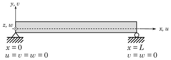 Boundary conditions of the solid beam. The dashed line represents the neutral fibre.