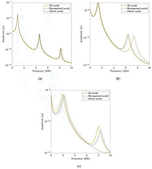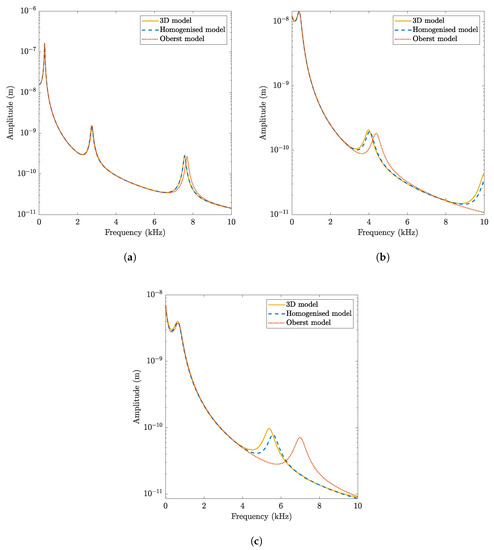 In view of the results, the main conclusion is that the homogenised model is able to reproduce the response obtained by the solid model in terms of amplitude and position of the resonant peaks for every case, while the Oberst formulation misses the highest frequency peak in the thick case.
