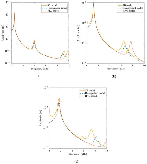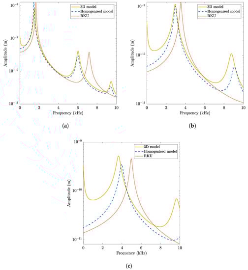 It should be highlighted that the RKU is not able to reproduce the high frequency peak and presents accuracy problems for the second one even for the thin plate. The homogenised formulation, on the contrary, correctly reproduces the frequency response for the thin plate in terms of amplitude and frequency. When both the thickness and the frequency increase, the deviation starts to be noticeable, even for the homogenised formulation, especially regarding the amplitude. This is related to the contribution of coupled in-plane and out-of-plane motion that is higher for CLD plates than for any of the structures analysed in this work.