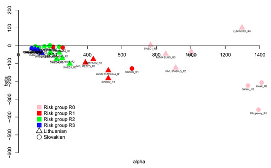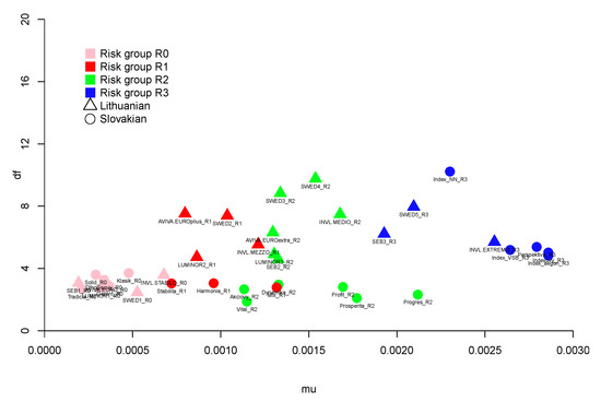 Next, the averaging is done within particular risk groups in Lithuania and Slovakia separately using . From the last column, it is easy to deduce that the funds operating in Lithuania are more preferable that those operating in Slovakia, with the exception of risk-free funds. The average SD ratio for the R0 group of Slovak funds is , while, for Lithuanian funds, it is . Such a difference indicates that, on average, risk-free Slovak funds are better managed than Lithuanian funds. It is worth emphasising that Lithuanian low-risk (R1) funds are much more preferable than Slovakian R1 funds since their estimated average SD ratio is much greater than . Notably, the most preferable fund overall, INVL.MEZZO_R1, is from this group, with , and its equal to 49, while the most preferable Slovak fund, Klasik_R0, has . The greatest difference between two countries in average SD ratio is observed in Group R2, where and . The low SD ratios of Slovak funds indicates a subpar average performance compared to other funds.