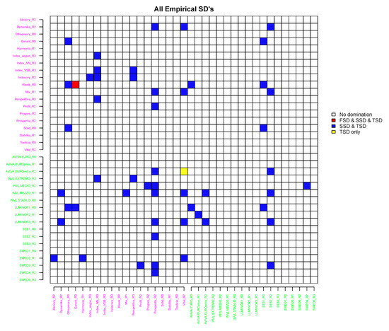 In this section, the stochastic dominance relations are analysed for the empirical weekly log-returns of each PF, with the equal probability assigned to each observed return. In order for the analyses to be interpretable over a wide range of risk preferences, we carried out experiments for all three criteria within the SD framework (FSD, SSD and TSD). The procedure involved making pairwise comparisons between any two funds, and , .