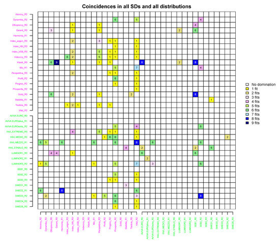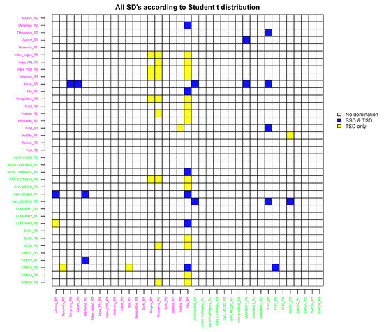 . The value of 6 can be obtained for at least two SSDs and four TSDs. However, these cases mentioned are not of interest to the investor because the number of identified relations is less than median possible value and the of SD relation may be treated as weak. Moreover, there may be situations in which the SD was not observed under a single specific distribution, e.g., for the pair Dynamika_R2 and Prosperita_R2, no SD was identified under the student-