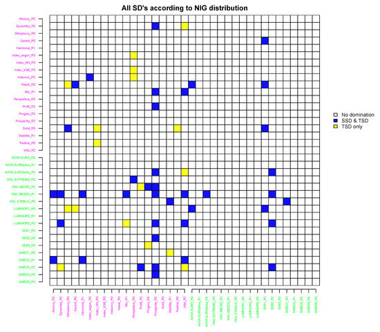 , SSD and TSD relations were found under a single distributional assumption (e.g., Index_aegon_R3 and Index_NN_R3 in the empirical case) or two TSD relations were found under different distributional assumptions (e.g., Solid_R0 and Index_NN_R3 in the case of the NIG and hyperbolic distributions). Similar situations occur for the values of 3 and 4. The value