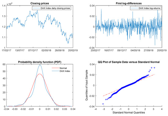 Daily quotes of the DAX XETRA Index. Compiled by the authors based on DAX XETRA Index and conducted in the Matlab R2019a software. Top subplots represent both, the daily traded prices and continuous compound returns over the period that spans from 17 February 2017 to 20 February 2019 (in-sample period). The bottom subplots report on the non-normal behavior of financial time-series, via the quantile–quantile plot (qqplot) and the Kernel graph, respectively. First, the Kernel graph compares the probability density function (pdf) of the empirical DAX XETRA returns with regard to the standard normal pdf. Last, the qqplot confronts the quantiles of the empirical distribution against the standard normal quantiles.