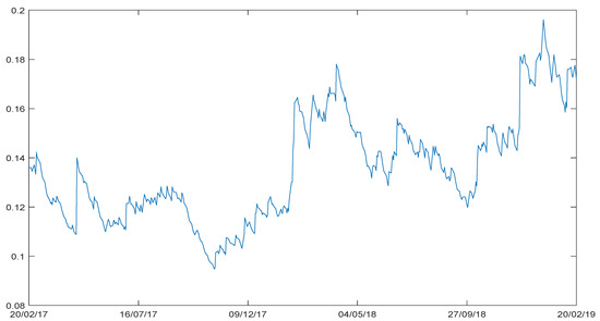 AR(4)-GARCH (1,1) estimate of conditional volatility for the DAX-XETRA index. Compiled by the authors based on DAX XETRA Index daily compound returns and conducted in the Matlab R2019a software. This figure shows the movements of the GARCH (1.1) volatility over the timeframe that spans from 20 February 2017 to 20 February 2019 (in-sample period).