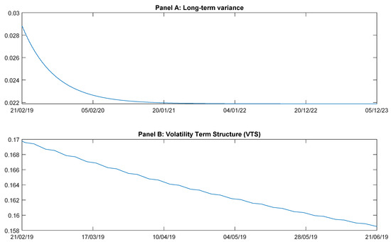 AR(4)-GARCH (1,1) forecasting. Compiled by the authors and conducted in the rugarch package of R-Studio. Panel A reports on the forecasting of the long-term variance over very long-term horizons (e.g., from 21 February 2019 to 5 December 2023). As time goes by, the daily annualized variance tends to the long-term parameter. Panel B reports on the Volatility Term Structure (VTS) computed on the basis of the GARCH model for the time period that runs from 21 February 2019 to 21 June 2019, displaying a negative slope over the considered horizon.