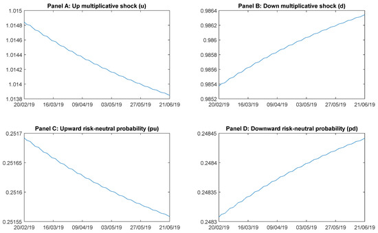 Temporal evolution of the risk-neutral Binomial-GARCH parameters. Compiled by the authors and conducted in the Matlab R2019a software. Panels A and B show the up (u) and down (d) multiplicative shocks of the Binomial method. In contrast, panels C and D show the upward (Pu) and downward (Pd) risk neutral probabilities of the barrier option premiums. All of the panels comprise the time interval from 20 February 2019 to 21 June 2019.