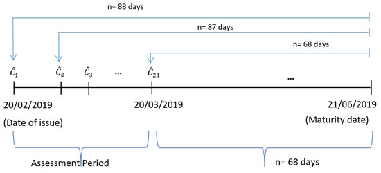 Timeline for Binomial and Trinomial trees. Compiled by the authors. Figure 6 shows the timeline used to forecast the option premiums of the diverse barrier options through the Binomial and Trinomial trees. The assessment period spans from 20 February 2019 to 20 March 2019, thus obtaining 21 trees. The considered trees, both Binomial and Trinomial, are built under a daily step size. The first tree is built for the period that ranges between 20 February 2019 and 21 June 2019, i.e., a time interval of 88 days. Second tree, lost one observation, ranging 87 days that correspond to the period that spans from 21 February 2019 to 21 June 2019. Subsequent trees are built in the same vein. Last tree considers the interval between 20 March 2019 and 21 June 2019. Note that depicts the valuated option premiums at each time ().
