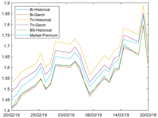 Binomial and Trinomial trees have been constructed on a daily step basis, ∆t = 1 day, for the time interval from 20 February (issue date) to 21 June 2019 (maturity date), obtaining 21 trees with respect to historical volatility and another 21 trees regarding GARCH (1,1) volatility, as reported in Figure 6. The first tree has a number of steps, n, of 88 days and the last reaches a total of n = 68 days (see Figure 6), i.e., we can forecast the price of the premiums, , of the selected barrier options over 21 days (from 20 February to 20 March 2019).