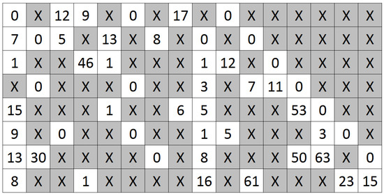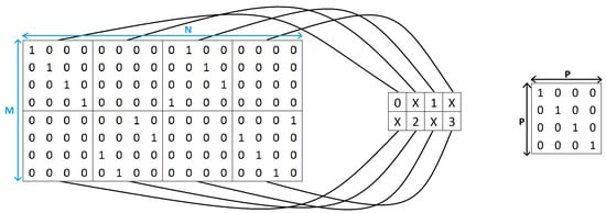 An example parity check matrix of QC-LDPC code, constructed for this research with a method presented in [20], is shown in Figure 2. The size of the submatrix is in this case, the size of the matrix is and the code rate is . The minimum number of non-zero elements in rows is 6 and the maximum number is 7. For columns these are respectively 2 and 7. It means this is an irregular code with the maximum column weight of 7.