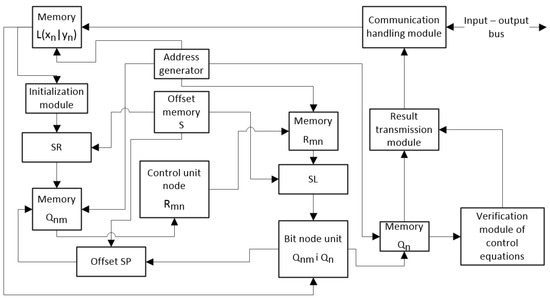 In the next stage, the control equations are verified according to (6). Control equations are checked in verification module of control equation. If all control equations have been met, the result transmission module begins reading data from the memory by transferring it in the correct order to the communication handling module. Otherwise, all calculations are repeated, starting with the control unit node. Decoding can be interrupted if the assumed maximum number of iterations has been reached. Each of the presented elements of the QC-LDPC decoder has its own control unit that is responsible for its proper operation.