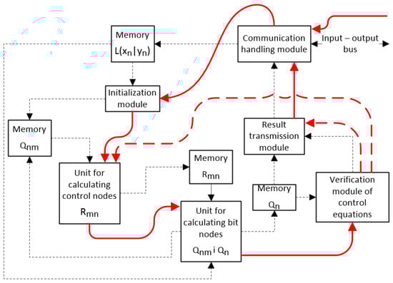 Figure 4 shows a simplified layout of the QC-LDPC decoder, which indicates in what order the Token is activated. The red arrows indicate the stages of running the distributed control system. The dotted arrows are optional and, depending on the decision made by the verification module of control equations, the Token will be passed to the result transmission module or the unit for calculating control nodes.