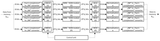 The values of the minimum and the sign are determined in P separate Min-Sign modules operating in parallel, then normalized by the parameter, according to (8). After multiplexing in MUX, results are converted back from the SM representation to the two’s complement format and saved in the memory.