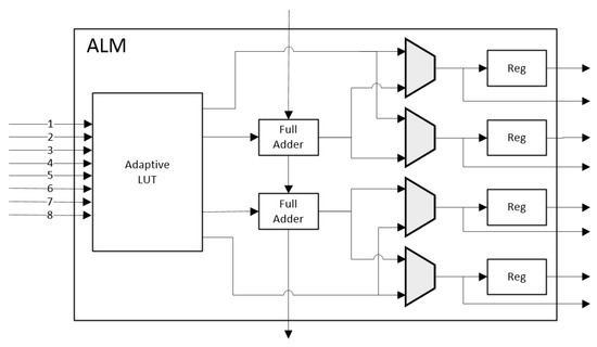 The typical FPGAs chip contains an array of programmable logic blocks (ALM—Adaptive Logic Module in the case of Intel devices) and a hierarchy of reconfigurable interconnections that allow the blocks to be wired according to the specific project needs [23]. The ALM block consists of combinational logic (LUT), adders and registers [24]. The design of the ALM unit is shown in Figure 8. Each LUT has a maximum of 8 inputs and can be configured to realize any logic (binary) function.