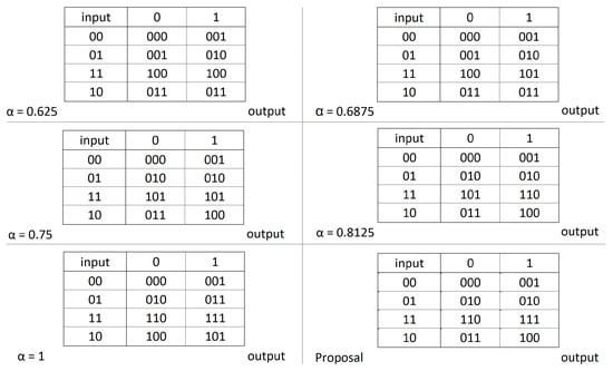 However, since the linear normalization is just an approximated method of belief calculation, we assumed that it is possible that application of another (non-linear) normalization functions, can result in not worse, possibly improved decoding correction performance. An example is the function presented in the last set of Karnaugh maps, labeled “Proposal”, which is an arbitrarily chosen map, experimentally shown to give the best results, at least for the case codes that we have experimented with. This map is similar to -normalization, but not exactly the same, and—as will be shown—results in an improved decoding performance of the implemented decoder. Moreover, this map can still be implemented in a single LUT of the FPGA. A logic function resulting from the synthesis of Karnaugh maps can be implemented directly in an LUTs. Implementation of the normalization expressed as a logic function is beneficial due to the direct fit into the FPGA architecture with LUTs.