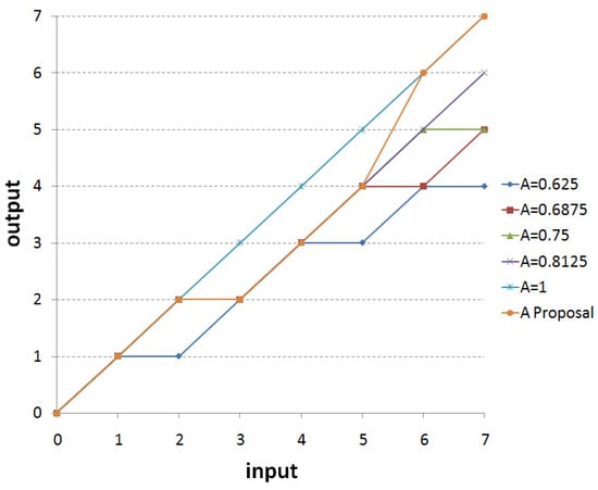 Figure 10 presents graphically the dependence between 3-bit input module (represented by an integer in the range ) and 3-bit output of normalization modules, for a few investigated normalizations, including the “Proposal” function that showed the best correction performance in our simulation experiments, as will be presented in the next section.