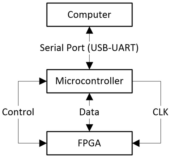 A special test environment was developed for the purpose of experimental research, the block diagram of which is presented in Figure 11. The environment consists of three key elements: computer (PC), microcontroller (eval-board STM32F4DICOVERY) and FPGA system (eval-board with Cyclone V device). The PC computer runs a system simulation software developed in Python, modeling random data generator, LDPC encoder, Binary Phase Shift Keying (BPSK) modulator/demodulator, AWGN (Additive White Gaussian Noise) channel and LDPC decoder. The encoded and modulated data is disturbed using the AWGN channel model, with noise level according to the variable Signal-to-Noise Ratio (SNR). The erroneous data is then corrected (decoded) by LDPC decoding software. Such a testing system allows verification of the correction properties of the LDPC code with given parity check matrix . The results of the simulation the form of Bit Error Ratio (BER) vs SNR in an AWGN channel can be used as a reference chart for hardware implementations of the LDPC decoder.