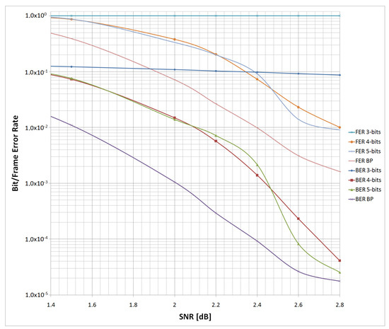 Figure 12 shows the observed error correction performance of the QC-LDPC decoder implemented in the Cyclone V (FPGA), illustrating dependence on the message (belief) precision. The Bit Error Rate (BER) and Frame Error Rate (FER) curves for the 3-bit data reflect very poor correction performance for the presented SNR range. Meanwhile, the 4-bit and 5-bit precision decoders correct errors with effectiveness increasing with SNR. Differences in BER and FER curves between 4- and 5-bit cases depend somewhat on the SNR, but they are not very significant. Therefore, in general a 4-bit bus is recommended, because of its better correction properties than the 3-bit solution and less hardware utilization in relation to the 5-bit solution. All tests were performed for the parity check matrix shown in Figure 2 and the maximum number of iterations of 15. Figure 12 as a reference provides the corresponding BER and FER curves obtained from computer a simulation with the floating-point precision BP decoding.