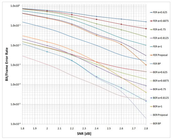 Table 1 shows the hardware requirements, obtained as a result of logic synthesis of a few selected configurations of the QC-LDPC decoder. It can be observed that as the data bus size increases, the hardware utilization for ALM units and memory bits also increases. Meanwhile, the normalization choice, including the proposed non-linear variant (“Proposal”), has no impact on the decoder hardware utilization. Therefore, the Proposal can be applied without any implementation overhead.