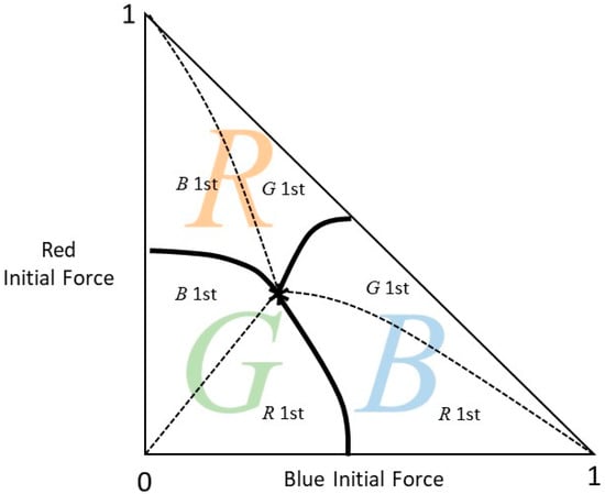 Suppose that Blue and Green are fierce opponents and both of them allocate an equal and large share of their force one against the other. Only a small fraction of their force is deployed against Red. Red is flexible to select how to balance its allocation of force against its two opponents. Figure 3 presents the winning regions of the three forces. In region i, i = B, R, G, player i wins regardless of the force allocation by the other players. In region R*, Red can win if it optimizes its force allocation . In region X, Red loses but it is the “victor maker”; it can determine the winner between Blue and Green.