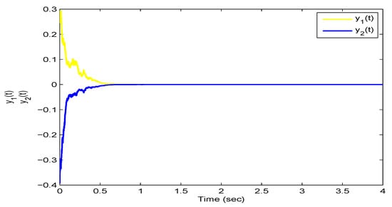 By taking , which satisfies and , and by applying the MATLAB LMI toolbox, we can obtain the following feasible solutions for the LMIs (34) and (35):