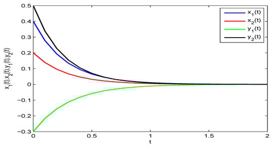 Under the initial conditions , Figure 1 and Figure 2 depict the state trajectories pertaining to the real and imaginary parts of the NN model in (1), respectively. From Figure 1 and Figure 2, we can see that the state trajectories of the NN model (1) converge to the equilibrium point.
