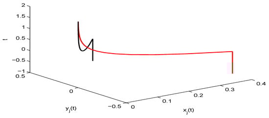 Figure 3 depicts the state trajectories with respect to the real and imaginary parts of the CVNN model in (32), subject to the initial conditions . The phase trajectories with respect to the real and imaginary parts of the CVNN model in (32) are given in Figure 4. By Corollary 2, it is straightforward to confirm that the equilibrium point of the CVNN model in (32) is globally asymptotically stable.