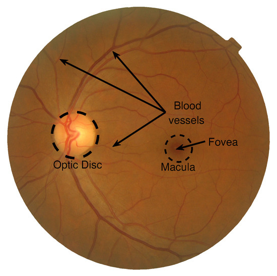 Retinography is a noninvasive diagnostic technique that certainly does not use contrast agents in the acquisition process [17]. This technique produces color images from the inner part of an eye, well-known as Fundus Images (FIs), which can be used to detect some diseases, e.g., diabetic retinopathies and glaucoma. These images are characterized by a quasi-circular shape with a small rectangular flange that represents the Field of View (FoV) of the capture device. Figure 1 shows the typical internal structures composing a fundus image.