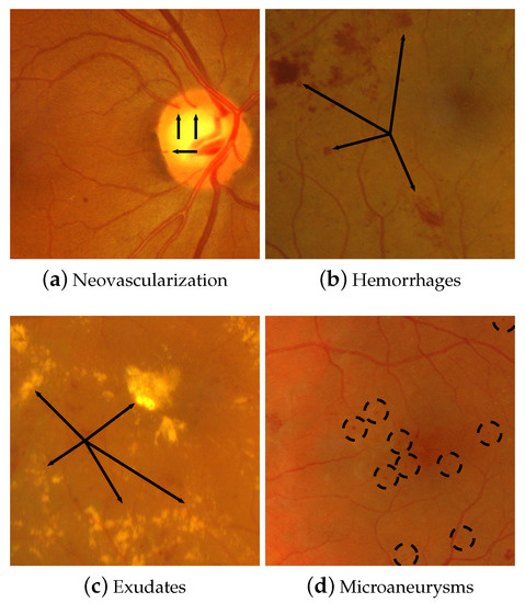 In general, the fundus images from healthy-patients have four common elements: the optic disk, blood vessels, fovea, and macula (see Figure 1). The Optic Disk (OD) is a circular and bright structure that interconnects the internal and external parts of the eye. Crossing the OD, there are the blood vessels and optic nerve [8]. The blood vessels are typically reddish tubular structures that exchange oxygen and move essential nutrients from and into the human eye. These structures, identified as veins and arteries, are spread in the image as a complex network connected with smaller elements known as venules and arterioles in their extremities. Found close to the optic disk is the fovea, visually recognized as an oval or circular red region. This element is extensively irrigated by the choroid, which is a membrane free of blood vessels. Located in the fovea, the biological photoreceptor cells, namely cones and rods, transform the light stimuli into electrical signals transmitted by the optic nerve to the brain. Additionally, the fovea is surrounded by the macula that is specialized in the perception of details. Under certain circumstances, specific features of these elements are used to determine the physical or mental health of a patient. For instance, recent studies have shown a direct link between the retinal state and its association and potential use in the diagnosis of dementia [18], Parkinson’s [19], and Alzheimer’s diseases [20], as well as other cognitive deficits [21] and neurodegenerative conditions [22]. In the same context, modifications in shape and optic disk size are a clear pointer to serious illness like glaucoma. However, different circumstances influence the appearance of extraneous biological structures in FI, most of them attributed to retinopathies. Retinopathy is a noninflammatory retina disease that can also include other medical conditions [10,18,20]. Particularly, diabetic and hypertensive retinopathies are the most studied and well-known retinal diseases. Both medical conditions may provoke similar symptoms (i.e., extraneous structures in the image), but the number, shape, size, and apparition probability may distinctively characterize each disease. Besides, its presence in the retina is highly influenced by the disease evolution degree. These representative structures are used as a starting point for the diagnostic assessment of retinopathies. Figure 2 illustrates the most distinctive structures characterizing retinopathies, such as neovascularization, hemorrhages, exudates, and microaneurysms.