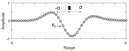 All the FOGFs are generated using the kernel obtained with (1) and the normal distribution function . In such a kernel, a set of four parameters should be estimated, i.e., the fractional-order , the domain x, the mean , and the standard deviation . However, to determine x two parameters (n and ) are required, such that x is rendered by n elements uniformly distributed in the interval . Figure 5 shows an illustrative example of the kernel parameters.