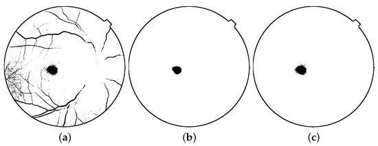 Given that the main objective of this work is the removal of blood vessels in the original image rather than a precise detection, a length filter with a fixed threshold is exploited. This last threshold is applied to the normalized version of the vascularity image (). Under these circumstances, a threshold value of is used to create the candidate image by . Finally, the vascularity image is segmented utilizing the length filter given as