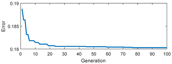 Bear in mind that the evolution of (cf. (6)) is plotted for 100 generations. An averaged error of 0.1888 is found only in the first generation. However, the DE method evolves towards a better solution with each new iteration. Therefore, the model coefficients can be selected from a wide range of combinations (or search space) without significant variation in errors. In the implemented version, the parameters were constrained to positive values and rounded to the upper integer. DE allowed determining the best performance by tuning the FOGF, as Figure 10b shows.