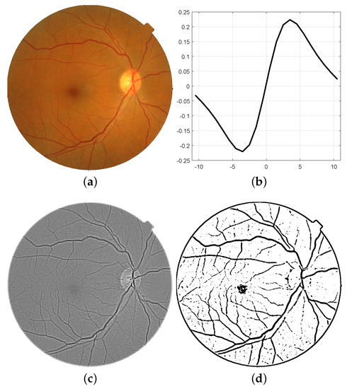 where corresponds to the minimal area that is maintained by the n-th region in to be considered as a blood vessel. A representative result using the fixed length filter () is also presented in Figure 8d.