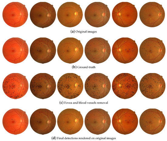Subsequently, Figure 10c presents the resulting image after applying these filters to a retinal image. Still, FOGFs detect not only microaneurysms but also blood vessels, fovea, and hemorrhages. Such undesired misclassifications can be attributed to the objective function properties and the intensity similarities between the target structures. Contrarily to the resulting image presented in Figure 10b, the exudates are distinguished and extracted from the one shown in Figure 10d. This last result was computed using the Kittler thresholding, where microaneurysms, hemorrhages, blood vessels, and some fovea pixels are accurately detected. It is noteworthy that the method selectivity on detecting microaneurysms and hemorrhages is boosted by using peculiar features, shapes, and sizes. Figure 11 exhibits microaneurysms and fovea detection. Previously, the fovea and blood vessels removal function was efficiently executed.