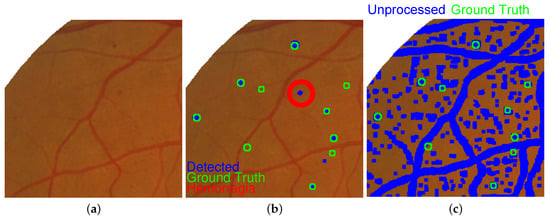 There, an average balanced accuracy of 0.8909 and an average sensitivity of 0.7820 were singularly representatives. Note that all detected regions were considered to build this table. Accordingly, the results contain only a few pixels belonging to hemorrhages or blood vessels. Thus the size could allow discriminating between microaneurysms and hemorrhages, the retinopathy degree is assigned by computing the number of detected elements from each one of the classes. Results of microaneurysms and hemorrhages detection are shown in Figure 12. The proposed method gives the results depicted in Figure 12b, and the result after applying the Kittler thresholding method is presented in Figure 12c. In that image, the reference microaneurysms are displayed in green and those detected by the proposed method in blue. As expected, the result obtained by applying the thresholding method contains the majority of microaneurysms. Nevertheless, the proximity of these structures with some blood vessels gave rise to their elimination from the final result. In consequence, an efficient and robust method to detect and remove blood vessels is highly necessary for improving results. Moreover, most dispersed points in the reference image belong also to pixels from blood vessels, but they correspond to narrower blood vessels than the regular, continuous structures.