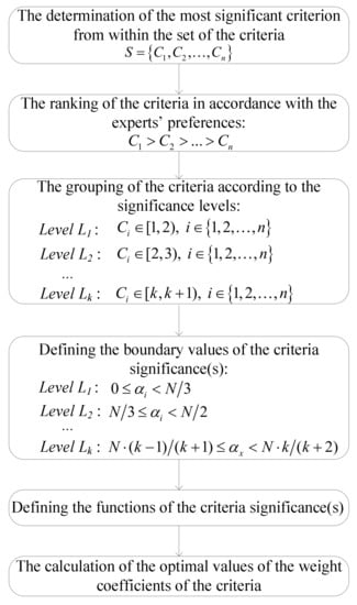 Allow us to assume that, in a multi-criteria model, there is a set S containing n evaluation criteria , and that the weight coefficients of the criteria have not been predefined, i.e., that weight coefficients need to be determined. Allow us also to assume that, in that multi-criteria problem, the criteria are ordered according to their significance (strength). Therefore, the weight coefficients of the criteria satisfy the relationships in which , with the condition that the criteria weights are normalized and meet the condition stipulating that .
