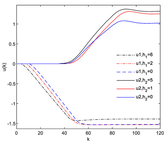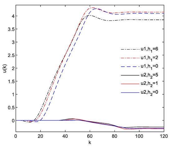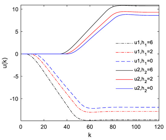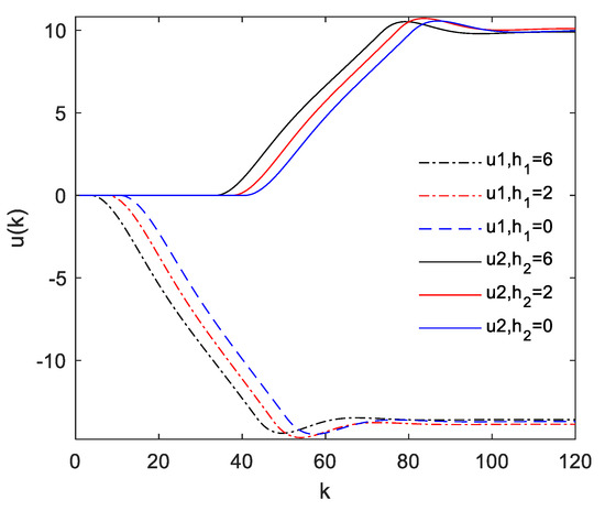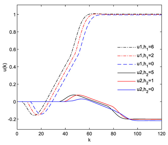 Similarly, for the output feedback case, the simulations were completed when the design methods in [11,13,15,26] were used. From these simulation results, we could find that the proposed output feedback PC had more advantages. Simulation and analysis were made separately under different situations of parameters and . Considering length limitations, the figures for these results would not be provided here.