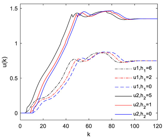 The construction methods of AES in [11,13,15,26] were employed, or, equivalently, the future information of was added to the augmented state vector to derive the AES. For comparison, we performed simulations for this case in [11,13,15,26] by using the same example. From Figure 1 and Figure 7, it can be seen that the future information of the signal components and interacted with each other. This led to poor tracking performance of System (1). In addition, From Figure 1, Figure 2, Figure 7 and Figure 8, we could easily see that our proposed PC provided better tracking performance than those in [11,13,15,26].