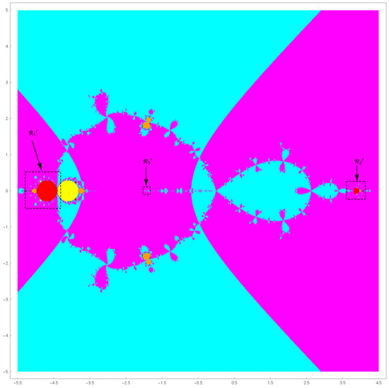 To debate the stability of the q-periodic point , we first consider the case for . Due to the fact that and , we find that 0 and ∞ are the fixed points as well as super-attractors in view of Proposition 1-(d). In this case, regions of corresponding -values are respectively colored in cyan and magenta in the parameter space in Figure 1. For the fixed point , we have and for in the yellow region of in Figure 1. For the -dependent fixed points , we find and for .
