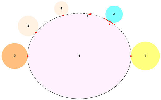 An exemplary curve consisting of such points is sketched in Figure 3 along with attracting q-periodic satellite [17] components denoted by and identified by numbers . Observe that represents a tangential vector at a parametric location . We extensively pursue the case when traces a boundary curve of a typical red fixed component as varies. For convenience of notation, we let denote the finite boundary of , and write for simple treatment of derivatives.