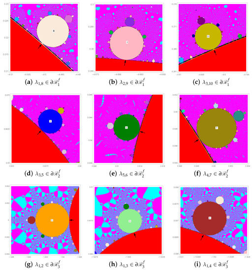 begin to emerge along the boundaries of . Hyperbolic components of -values for these q-periodic points are painted according to the color chart in Figure 5 of Reference [13]. Some of q-periodic components in are indicated by arrow numbers. If is chosen in such a q-periodic component, then the orbit of critical point attracts to a q-periodic point of . To generate the -parameter plane , Mathematica software has been used with 16-digits of precision for real and complex numbers. The desired convergence criterion for a q-periodic orbit was after maximum 3000 iterations.