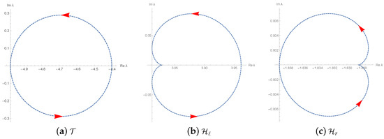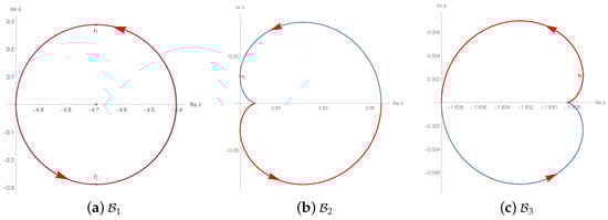 Any of is generally comprised of piecewise analytic arcs with singularities at and . The functions are plotted for in Figure 5. Let be a closed plane curve traced by for , which represents the boundary of j-th red fixed component . The symmetry of clearly reflects the symmetry of with respect to the horizontal axis. The blue arcs correspond to ones with .