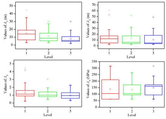 The box plot of each indicator for different pillar stability level is shown in Figure 2. According to Figure 2, some meaningful characteristics can be found. First, all indicators have several outliers. Second, the pillar stability level is negatively correlated with and (the Pearson correlation coefficients are −0.381 and −0.266, respectively), while is positively correlated with (the Pearson correlation coefficient is 0.433). However, there are no obvious correlations with and (the Pearson correlation coefficients are −0.121 and 0.079, respectively). Third, the distances between upper and lower quartiles are different for the same indicators in various levels. Fourth, there are some overlapping parts for the range of indicator values in different levels. Fifth, as the median is not in the center of the box, the distribution of indicator values is asymmetric. All these phenomena illustrate the complexity of pillar stability prediction.