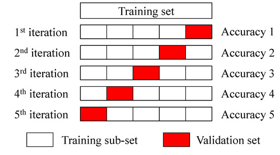 Most of ML algorithms contain hyperparameters that need to be tuned. These hyperparameters should be adjusted based on dataset rather than specifying manually. Generally, the hyperparameters search methods include grid search, Bayesian optimization, heuristic search and randomized search [43]. Because the randomized search method is more efficient for simultaneously tuning multiple hyperparameters, it is used to recognize the best set of hyperparameters in this study. In general, K-fold CV approach is utilized for hyperparameters configuration [44]. In our work, five-fold CV method is used, which is illustrated in Figure 7. The original training set is randomly split into five equal size subsamples. Among them, a singular subsample is adopted as the validation set, and the other four subsamples are used as the training sub-set. This procedure is repeated five times until each subsample is selected as a validation set once. Thereafter, the average accuracy of these five validation sets is used to determine the optimal hyperparameter values.