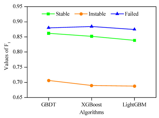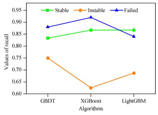 To analyze the prediction performance of algorithms for each stability level, the precision, recall and F1 indexes were calculated based on Equations (13)–(15), which were shown in Figure 8, Figure 9 and Figure 10, respectively. It can be seen that the prediction performance of each algorithm for different stability level was not the same. For the stable level, GBDT achieved the highest precision value (0.8929) and the highest F1 value (0.8621); and XGBoost achieved the highest recall value (0.8667). For the instable level, XGBoost possessed the highest precision value (0.7692); and GBDT possessed the highest recall value (0.7500) and the highest F1 value (0.7059). For the failed level, LightGBM obtained the highest precision value (0.9130); and XGBoost obtained the highest recall value (0.9200) and the highest F1 value (0.8846). Moreover, it can be observed that the prediction performance of these algorithms for failed level was the best, followed by stable level. However, the prediction performance for instable level was the worst.