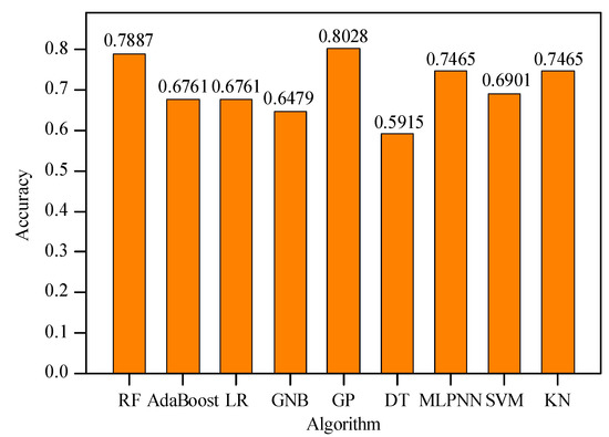 On the other hand, some ML algorithms, such as RF, adaptive boosting (AdaBoost), MLR, Gaussian naive Bayes (GNB), Gaussian processes (GP), DT, MLPNN, SVM, and k-nearest neighbor (KNN), were adopted to predict pillar stability. First, some key hyperparameters in these algorithms were tuned, and the optimization results were listed in Table 6. Afterwards, these algorithms with optimal hyperparameters were used to predict pillar stability based on the same dataset. The accuracy of each algorithm was shown in Figure 12. It can be seen that the accuracies of these algorithms were all lower than those of GBDT, XGBoost, and LightGBM algorithms. The accuracies of most algorithms (except for GP) were lower than 0.8, whereas the accuracies of GBDT, XGBoost, and LightGBM algorithms were all higher than 0.8. It demonstrated that compared with other ML algorithms, GBDT, XGBoost, and LightGBM algorithms were better for predicting pillar stability in hard rock mines.