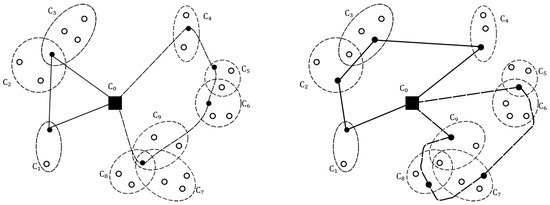 In Figure 1, we present two feasible solutions of the SVRP. We can observe that the total number of visited nodes may be different: six nodes are visited in the first feasible solution and eight in the second solution. If a belonging to the three clusters , and is visited, then all the nodes in the clusters , and are covered.